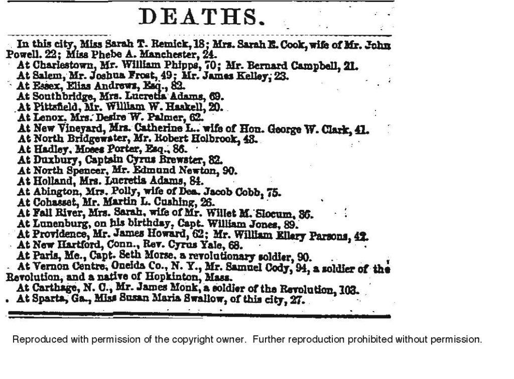 At Vernon Centre, Oneida Co., N.Y., Mr. Samuel Cody, 94, a soldier of the Revolution, and a native of Hopkinton, Mass.