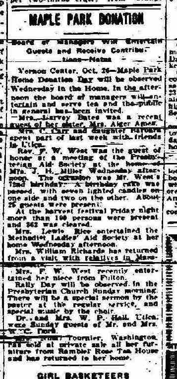 Vernon Center. Oct 26–Maple Park Home Donation Day will be observed Wednesday in the Home. In the afternoon the board of managers will entertain and serve tea and the public in general has been invited.